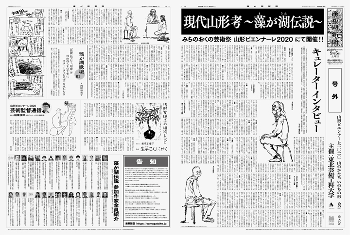 『藻が湖新聞』は、「現代山形考〜藻が湖伝説〜」(2020-2022)開催を機に不定期発行される、「新聞」の名を冠したアートプロジェクトです。「新しい生活様式」が標榜され、展覧会自体のありかたが再検討される時代、オンラインではなく「展覧会を届ける」ためのメディアとして立ち上げられました。毎号の連載(稲葉俊郎「芸術監督通信」、岡崎裕美子「藻が湖歌壇」、浅野友理子「浅野友理子の植物レシピ」、石原葉「記者Yが行く!!」)のほか、「現代山形考〜藻が湖伝説〜」の展示構成セクションに基づいた、この新聞でしか読むことができない特集内容を中心にお届けします。