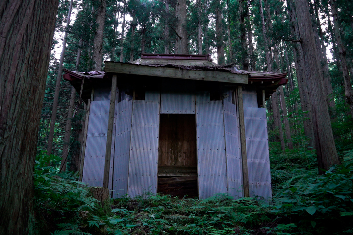 雷神社は二間四方・寄棟平入りとなっており、向拝に小さな縋破風が付く形式となっている。詳しい調査は伴わない個人的な印象だが、外観から見る限りはどこにでもある地域の社だ。あらゆる淘汰の末にかろうじて延命処置を続けてきた建物特有の佇まいがある。各所に応急対処の補修があり、屋根は極めて貧相で、軒は雪害を考慮したのだろうか短く、躯体構成との整合性もない。濡れ縁は半分以上が朽ちている。いつ、誰が、どのように補修 修繕し維持してきたのかも判別不能だが、この建物の維持管理に掛けられてきた様々なコストが大きなものではないことが見て取れる。本流の建築史的規範から見れば記述するに足らない建物だ。淘汰され失われて然る建物だ。このような建物は雷神社だけでなく、人の生活圏の中に数多存在している。