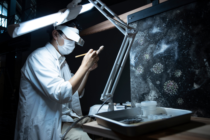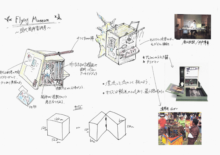 本作品は移動可能な修復所であり、地域の宝を守る博物館であるという意味を込めて「Flying Museum 移動式修復センター」と名付けた。グランドデザインを三瀬夏之介が描き、施工を大工の荒達宏が手がけ、修復家の井戸博章がここで実際の修復を行い、今後はキュレーター宮本晶朗の研究成果がhalken LLPのデザインワークによって納まる予定だ。