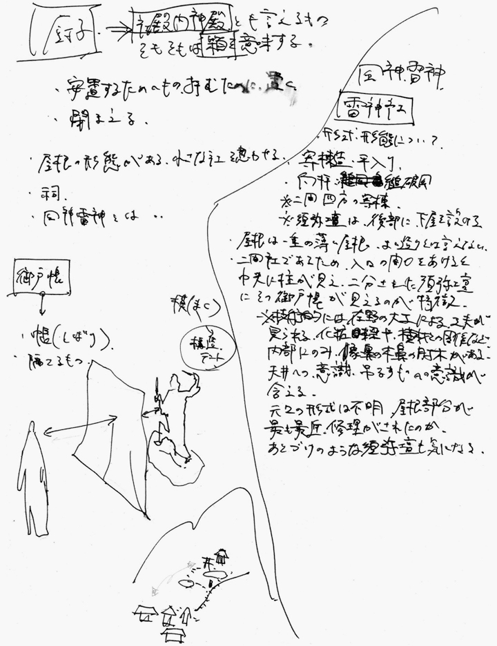 厨子とは簡単に言えば神殿内神殿のようなもので、箱を意味する。制作にあたり、大工という視点に立ち、雷神社を見なおしてみるといくつかの特徴的なこと があった。天井化粧梁の不自然な掛け方や、正面に向かってに中央にある柱とそれによって二分された須弥壇。御戶帳。須弥壇に至っては取ってつけたように増設したとしか思えない つくりとなっていた。そもそも風神雷神の為の社だったのだろうか。