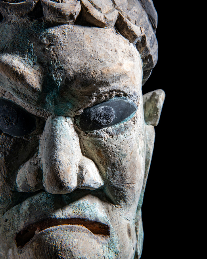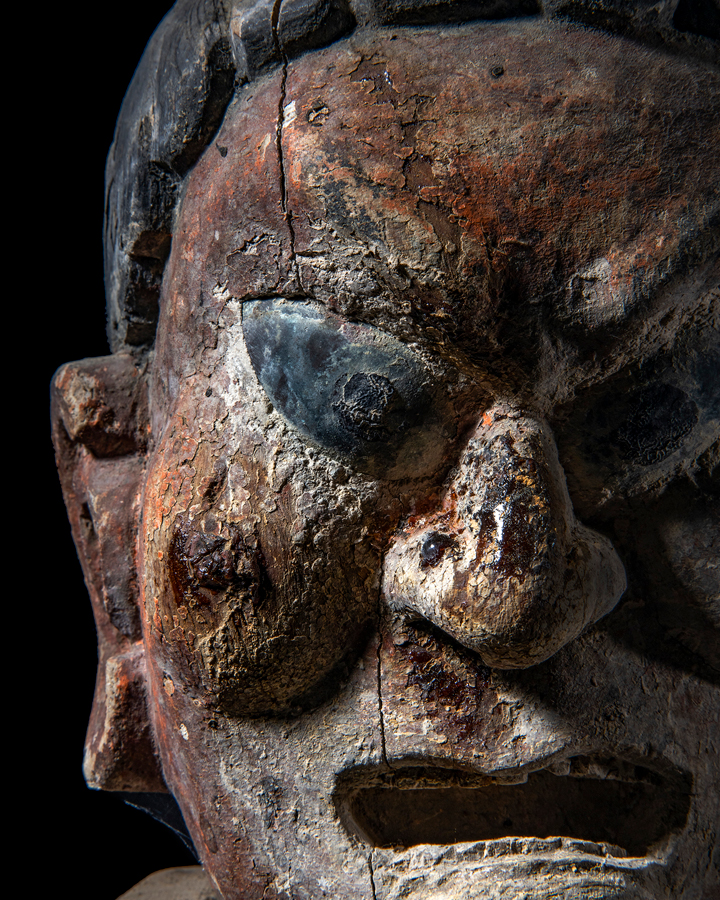 風神、雷神の顔は、環境による劣化が進んでいるが、血肉の通った生身のように傷つき、異様な迫力を感じさせる。長い年月放置され、朽ちかけた寸前に救い出された経緯、以前訪れた雷神社堂内に漂う暗く重い空気感、かつての祭事における役割。機械であるカメラの目は、次々に浮かぶ情報や記憶を切断し、像を照らす光と陰をただ定着させる。もしかすると、写真に人の感情や思いを込めようとする、その行為自体が一つの「祈り」に通じるのかもしれない。風神雷神像、二つの顔にかつて私が幼少の頃に抱いた恐れ、人々が捧げた数多の祈りの蓄積を思い撮影に臨んだ。