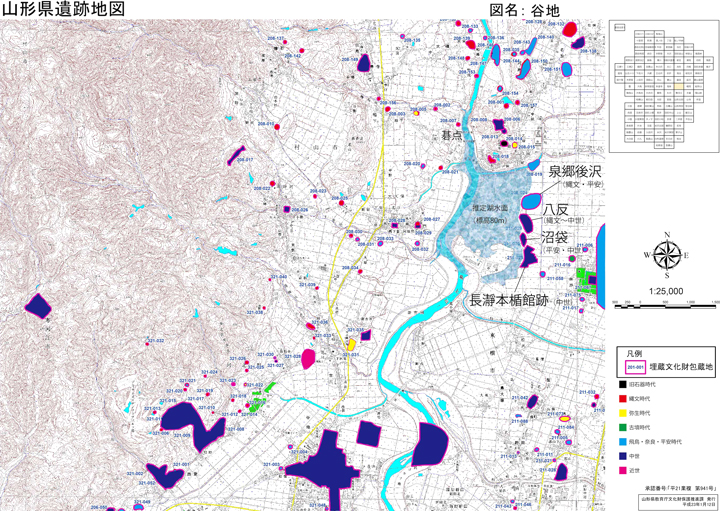 山形県教育委員会の遺跡地図を基に東北芸工大歴史遺産学科1年生が作成。8つの時代ごとにレイヤーを分けて着色している。遺跡は複数の時代にまたがる場合が多いため、図は遺跡の中で最も新しい時代を表示している。