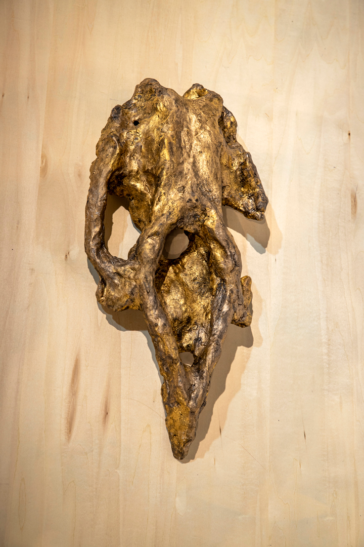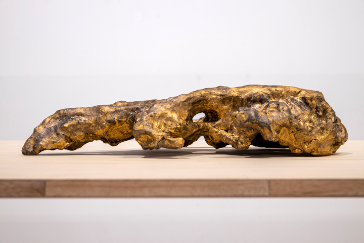 山形ビエンナーレ2020のメインビジュアルに使われるヤマガタダイカイギュウの化石を作品化する依頼を受け、県立博物館に取材を行った。ヤマガタダイカイギュウは約900万年前の海に住んでいた海牛類の祖先となる哺乳類で、昭和53年当時小学6年生の2人により大江町の最上川川床で発見された。これは山形が昔は海だった証拠と言える。3D出力された化石を実際に手に取らせていただき、形状の記憶を指と頭に叩き込んで、すぐに制作に向かった。