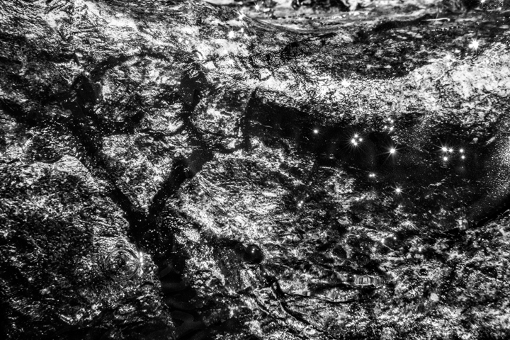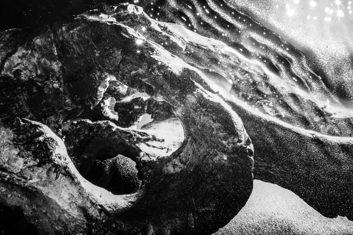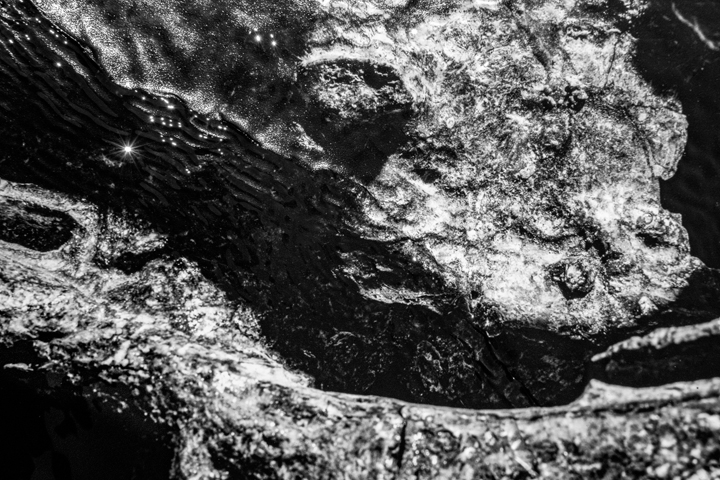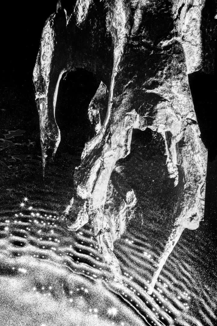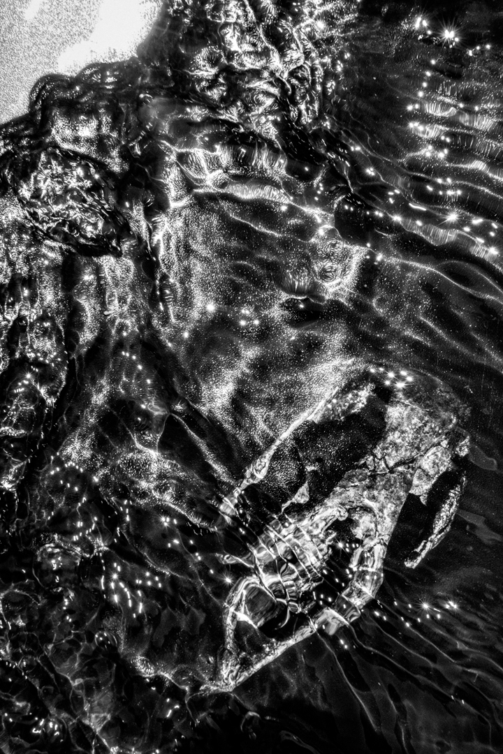 作品としての構想を巡らせ続け、遂には化石の発掘地を訪れ、プリントした写真を最上川に沈めて撮影した。かつて、ヤマガタダイカイギュウが息づいていた地に流れる風や水の音、日差しの暑さと水の冷たさ、生き物の気配、樹々や土のにおいを五感で感じシャッターを切る。一方、機械であるカメラは私の思いや感覚を切断し、光学的現象の結果として、ただそこにある光と影を定着させようとする。しかし、その写真は私が博物館でライティング、撮影したプリントの複写でもある。複製と実物、主観と客観、記録と記憶。対照的な複数のレイヤーの重なりを通し、写すことができない身体的なリアリティーを写真に込めようと試みた。