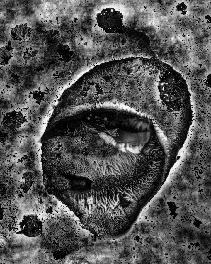 かつて伝説の「藻が湖」があったとされる山形県の上空地図をGoogle Earthより検索し(註1)、その写真から特殊な技法を用い印画紙へ露光、現像した。