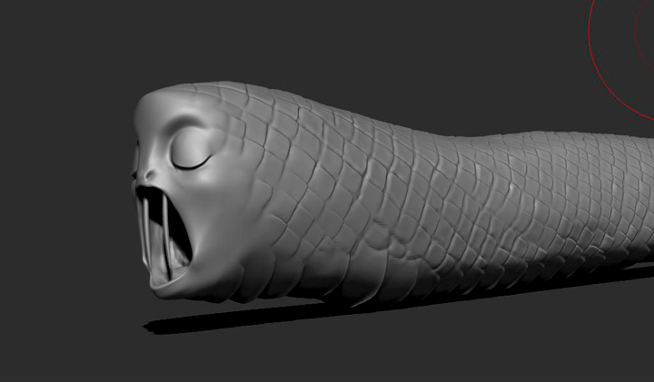 花田のラフデザインをもとに先﨑が3DCGで制作。蛇はどこからともなく現れて人々を大とかげの恐怖から救う。それは人々にとって神様、仏様のような存在だったのではないか。人から見る神は人の姿をしている。きっとこの蛇も人の姿をしていたに違いないと思った。CGでは生物的なヘビのデザインとは違い、平たい人間的な顔を持つどこか不気味で、神聖な雰囲気を漂わせるため試行錯誤を行っている。(使用ソフト:Zbrush)
