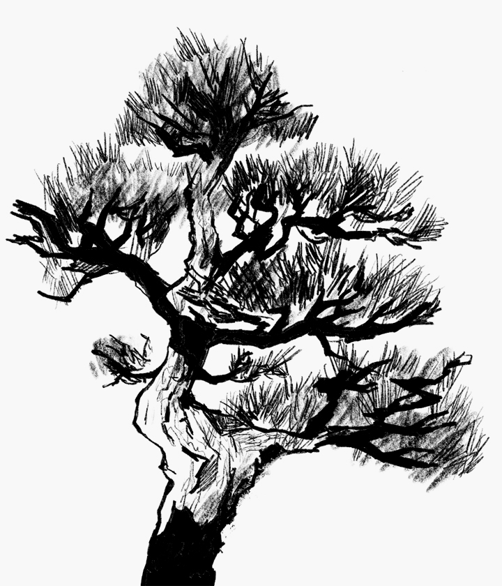 コンテから汲み取ったイメージを元に描いた松。今は物語の大蛇松をあえて意識せず、スタンダードな松のイメージをスケッチした。生まれたてである。その存在はどこか異質で畏怖すら感じ取れるよう、松はこれからも化け続ける。