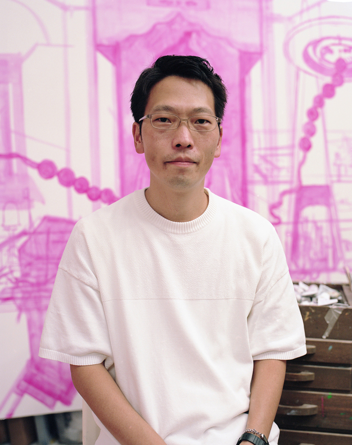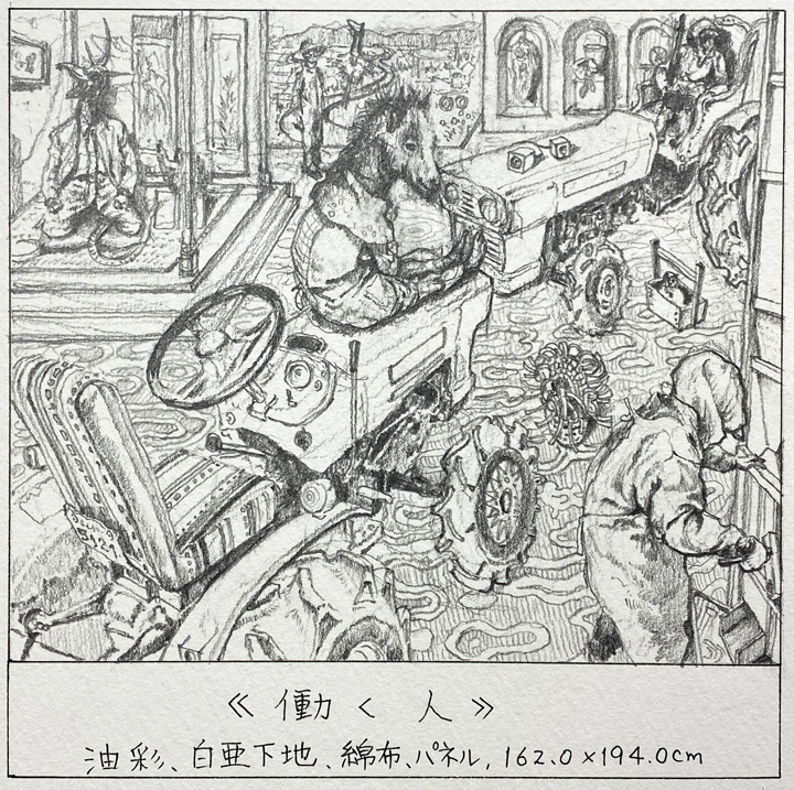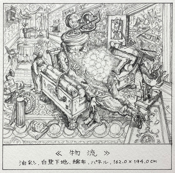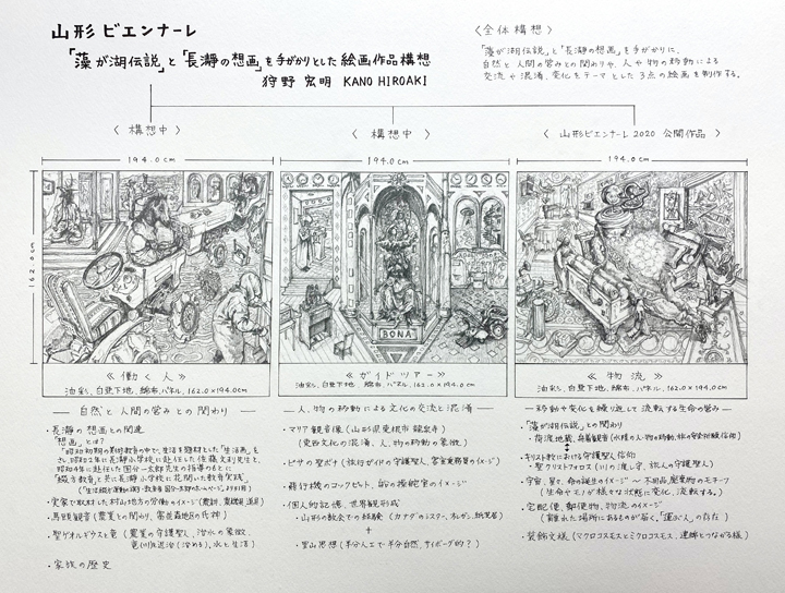作品は《ガイドツアー》《働く人》《物流》と題した3点の絵画で構成される。山形ビエンナーレ2020で完成作品を公開するのは3点の中の《物流》という作品である。