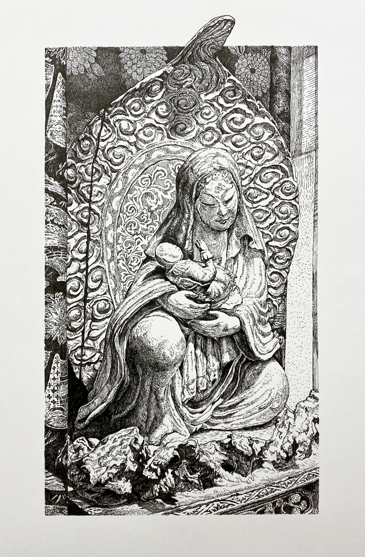 東根市の龍泉寺に残された「マリア観音像」を象徴的なモチーフとして、村山地方に関わりの深い観音や地蔵を、キリスト教における守護聖人信仰と重ね合わせて描く。