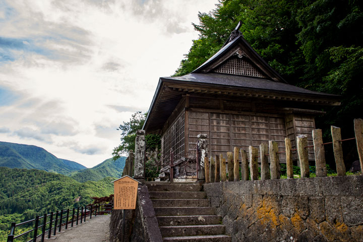 斜面地に建ち、道からの引きがないので建物の全貌は見えにくいが、入母屋の屋根を載せた木造平屋で、一見お寺の堂宇のようでもあるが、実は由緒正しい皇室建築である京都御所紫宸殿を手本としたものとされている。内部は、床の間を持つ畳敷きの8畳間に、半間幅の廊下が廻るシンプルな間取り。しかし、周囲の雨戸を開ければ、擬宝珠のついた高欄越しに三方に展望が開け、北に奥の院、東に胎内潜り、南に麓の馬形集落や二口峠を遠望できる、境内屈指の絶景ポイントでもあるのだ。東宮は本坊から自らの脚でここまで辿り着いて休憩、昼食を摂り、後にもう一度訪れてみたいとその感想を残したとされる。