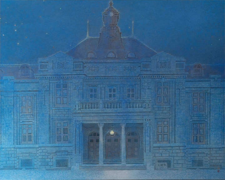 山形ビエンナーレでは山形県郷土館(文翔館)を描かせて頂きました。この建築物は1916年(大正5年)6月にイギリスルネサンス様式を基調とした100年を超える歴史ある建物です。本年4月初旬、まだ桜の蕾も固い時期、数日に渡り写生を取らせて頂きました。写生帖にどの様に構図を入れるかとても難しくとにかく建物の端から端まで全体を画帖のページを繋ぎ合わせ描き込んでいきました。写生時では様々な人との出会い、またコミュニケーションがあり自身の楽しみとあっております。文翔館のもつ美しさ、それに触れようとする人々、文翔館は山形市民の大きなシンボルとなっている様です。本画制作は夜の文翔館をコンセプトとし建物の荘厳さを夜の静寂感の表現につとめました。