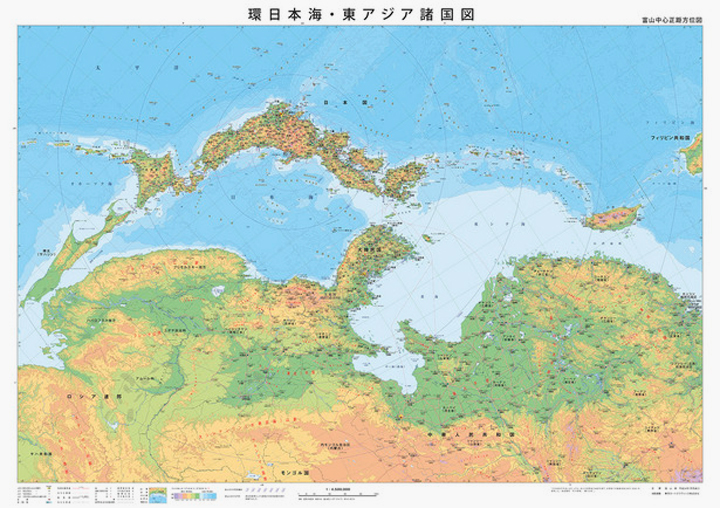 ここに日本列島が逆さまになった一枚の地図がある。「環日本海・東アジア諸国図」と名付けられたこの地図は富山県が発行しているもので、中国やロシアなどの大陸諸国に対して、日本の地理的な重心が首都東京ではなく、富山県沖の日本海にあるということが、日本列島を反転させるという最小限の手つきだけで強く示されている。この地図を眺めていると日本列島に住まう多くの人々がある固定概念に縛られているということがよく分かる。日本海と呼ばれているものは大陸から見ればただの内海に過ぎず、この国は中国、韓国、北朝鮮を塞ぐ大きな龍の形をした蓋のように見える。まるで湖のような日本海から、北は樺太・サハリンへ、南は南西諸島・台湾・フィリピン・マレーシアへとなだらかに繋がる群島の姿を神の視点で眺め終わった頃には、もうこの場所が日本であると断定すべき境界線はどこにも見当たらず、私にとっての「日本のかたち」が、渚に打ちつけられる波のようにあやふやになり、クラクラとめまいがするのだった。(この地図は富山県が作成した地図の一部を転載したものである)