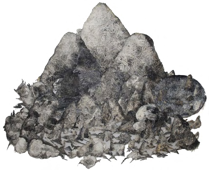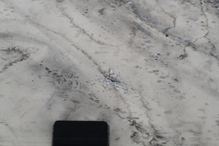 この絵には「日本の絵」というタイトルをつけた。ブヨブヨとだらしないボディを晒しながら漂流するのは、逆さになった日本列島(註1)だ。北海道や佐渡島、変形した九州などに列島の記憶が未だ残る。右画面の静岡と思しき場所には、富士山らしき日本の象徴が画面を突き破るようにそびえるのが見える。それでは左画面の大きな山は何かというと、私が現在住まう山形市の千歳山だ。ここには端山信仰(註2)という生者と死者に関わる風習が残る。そう、この図像は、私という主観によっていびつに変形させられた日本地図なのだ。その日本地図のある一点から同心円状に波動が放射され、まるで日本国旗のような表情を見せる。絵の中にはこの列島から脱出した最後のひとりが乗る小舟が描かれている。
