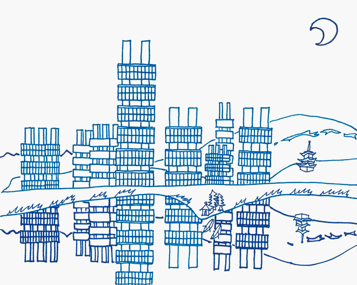 寒河江市は、細胞単位が増殖するように成長できるというメタボリズムの理論を実行し、住宅をはじめ学校、病院、美術館、図書館、体育館、プール、スーパー、といった、市民生活に必要な施設の全てを、寒河江市役所型の建築に集約することに成功しました。これにより、寒河江市は、都市型社会と農村型社会が完全に融合。次世代の都市として期待され、将来の急激な人口増加に備え、寒河江市役所型の構造体はさらに増殖されることが予想されます。その前夜、伝説の藻が湖が最新のテクノロジーで復活を果たし、湖面に映った寒河江市が、アイコンとして、人びとのこころに刻まれるのでした。