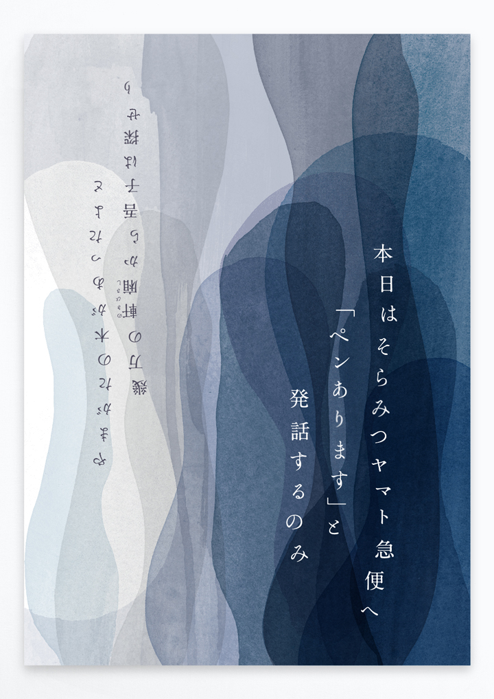 新国立競技場に纏わる、守られている森と守られなかった森、この2つの森の中にどう歌を存在させるかということを考えていた。そんな中、オリンピックの延期が決まる。1年後に開催すると言うけれど、正直、やるべきなのか?とさえ思う。たくさんの約束や予定が消え、手元にはその欠片のようなものが残った。私たちの生活はとても不確かなものの上に存在しているということが浮き彫りになった。岡崎さんから届いた歌は、急に目の前に現れた現実と、あるんだろうなと思っていた現実が同時に存在していた。歌を平面の上に真逆に置き、2つの森の木々のイメージを再構築していく。重力に抗い生きようとする流れは、逆さにするだけで失われていく流れになる。儚いものとして存在させるため、それを水に溶ける薄い紙にプリントした。