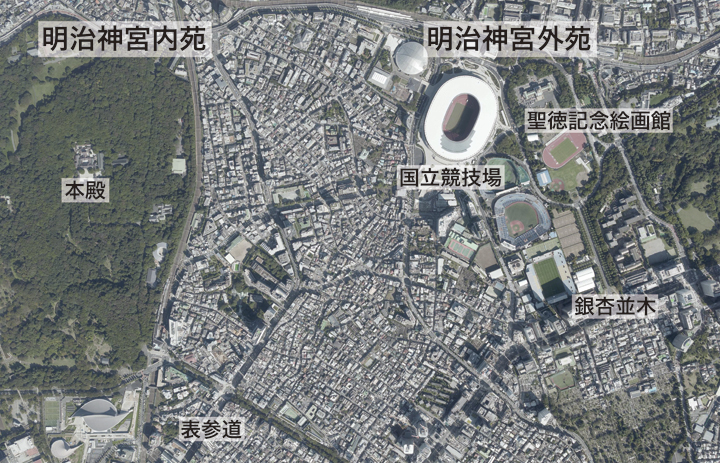 現在の明治神宮および周辺(国土地理院ウェブサイトの空中写真をもとに編集)